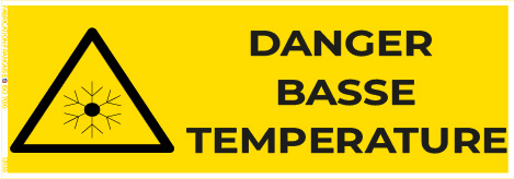 Ce panneau avertit des risques liés aux basses températures, rappelant la nécessité de porter des protections adaptées (vêtements, gants, équipements). Il contribue à la sécurité du personnel et à la prévention des accidents liés au froid.