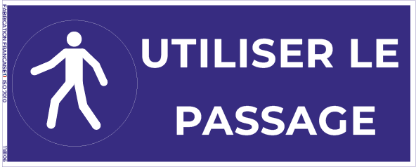 Ce panneau rappelle l’obligation d’emprunter le passage indiqué, assurant ainsi la protection des piétons et le maintien d’une circulation sécurisée dans les zones à risques.
